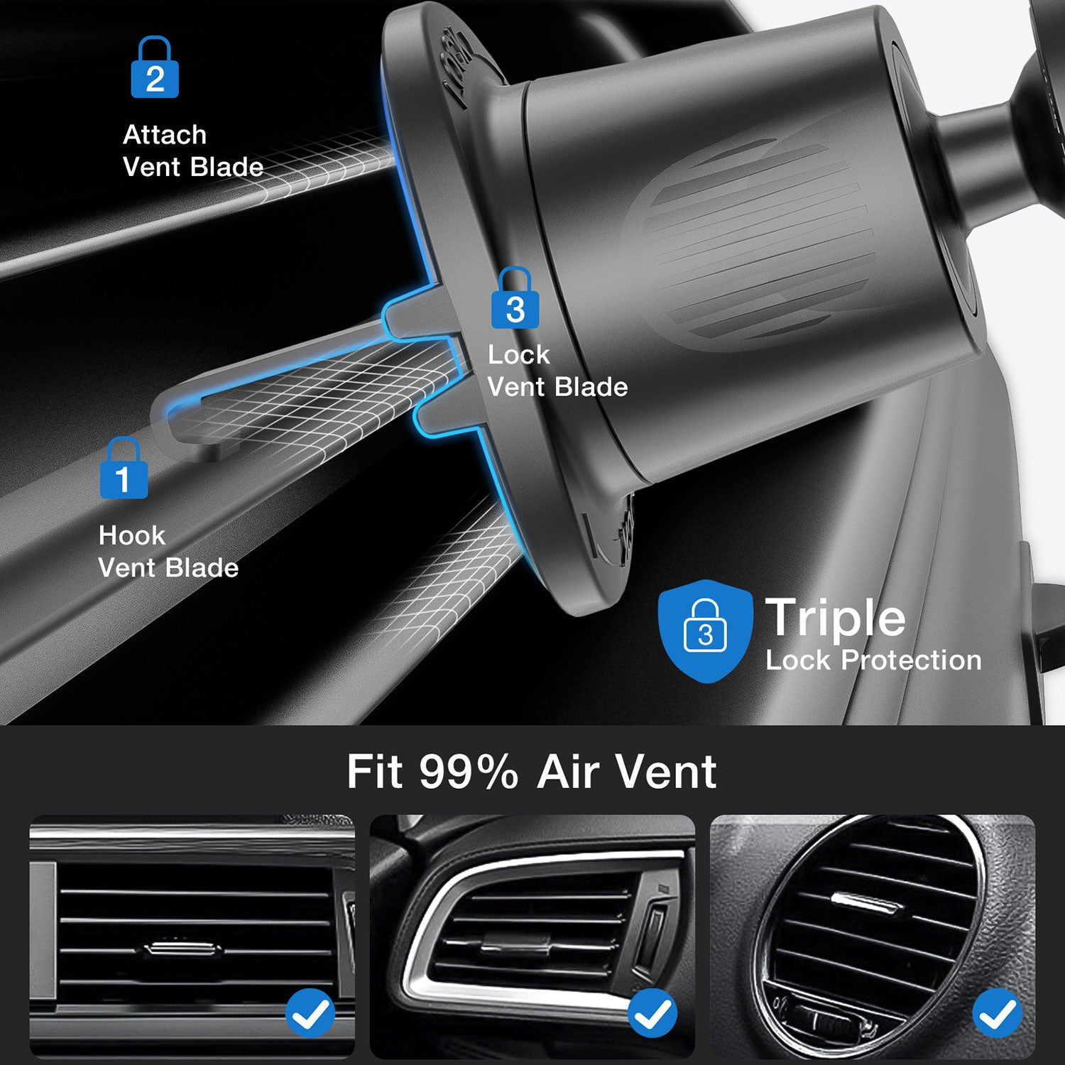 - Premium space saving and attractive design suitably blends in with any car interior without obstructing any visibility and does not block the air vents or your windshield to comfortably mount your device at the perfect placement that suits you best.