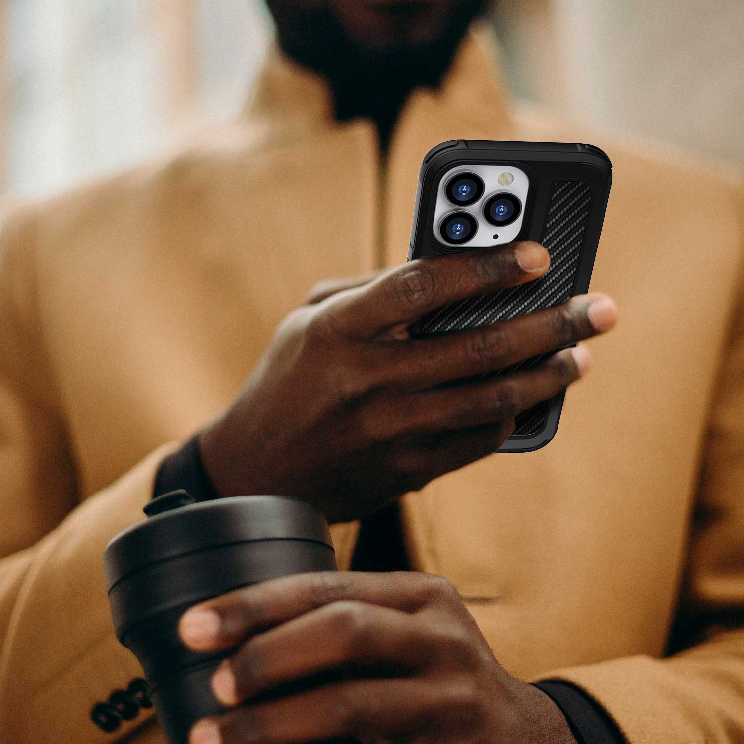 The phone cover’s carbon fiber-like aesthetic provides classic style and a smooth, sleek texture.