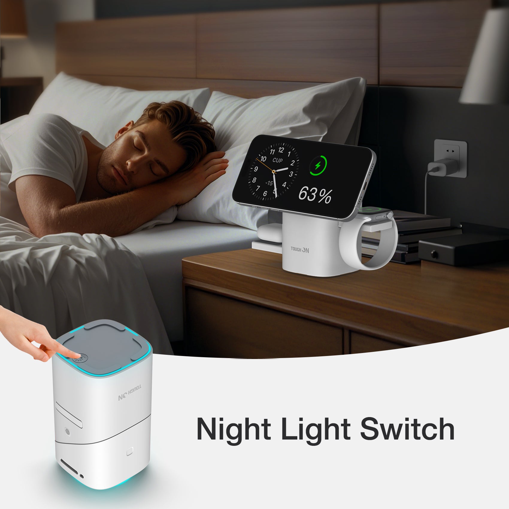 With a simple touch, you can rotate the phone charging stand to easily adjust the angle. The touch control also allows you to open or hide the charging slots for the Apple Watch and AirPods, enabling more efficient use of space.