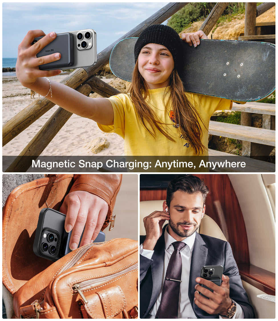 With a 10,000mAh capacity, this magnetic portable charger delivers up to 2 full charges for iPhone 14/13 or 1.3 charges for iPhone 16 Pro Max — reliable energy wherever you go.