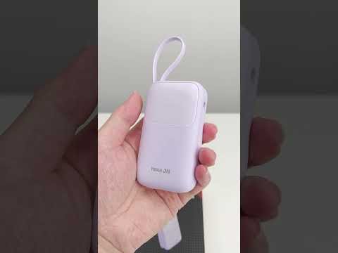 Portable Charger with Two Built-In Cables: Equipped with two built-in cables—one Lightning output and one USB-C input/output—for versatile charging options.