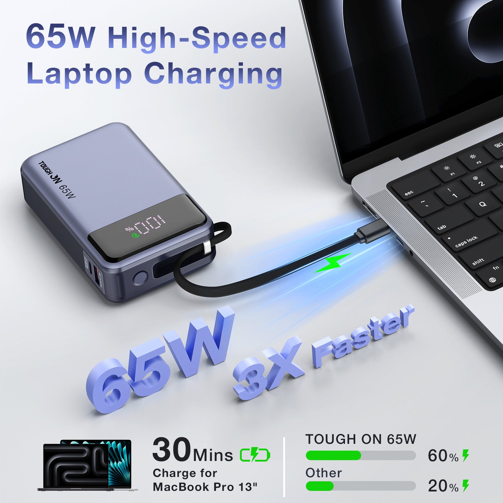 - Tough On 65W 20,000mAh Power Bank with Built-in USB-C Cable