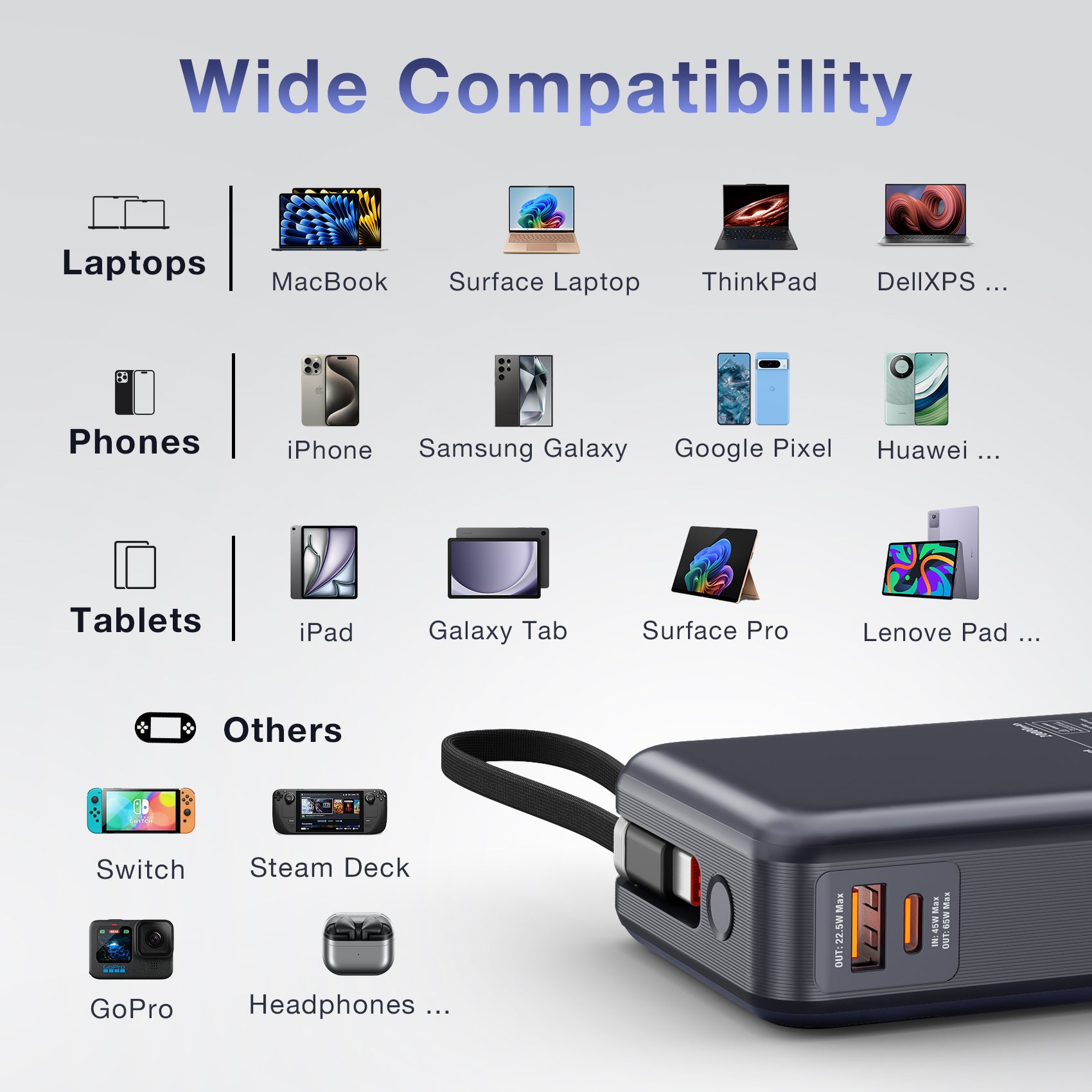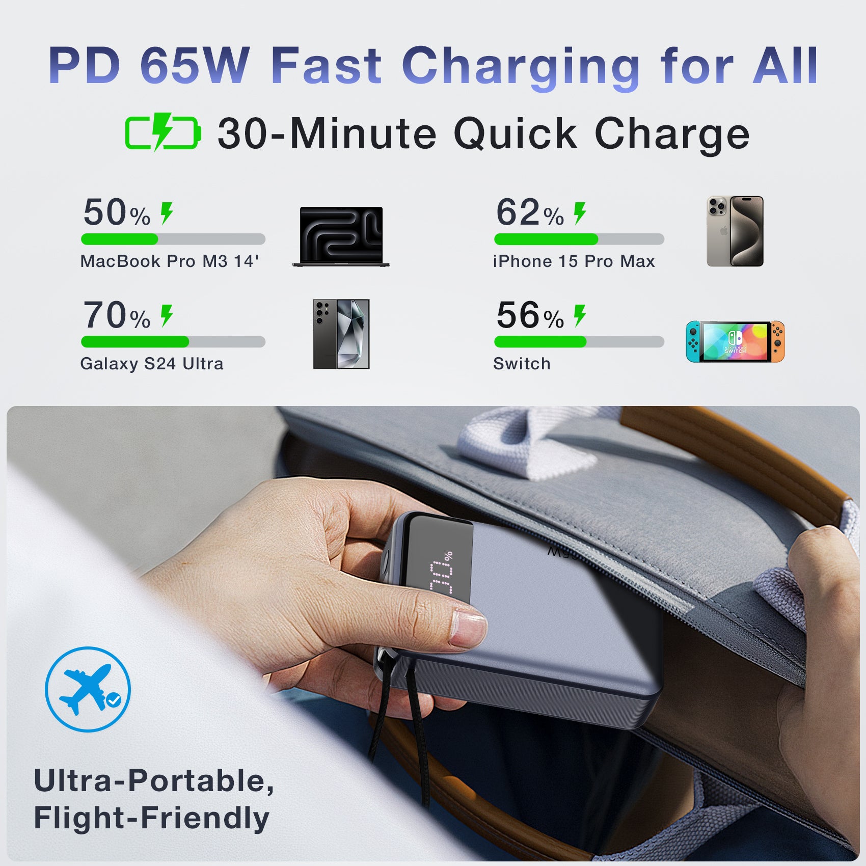 Charge your MacBook Pro 14‑inch, tablet, or phone quickly with up to 65W USB-C output. Get to 50% charge in just 30 minutes – perfect for long flights, business trips, or busy days on the go.