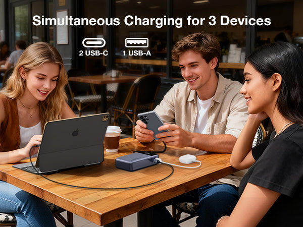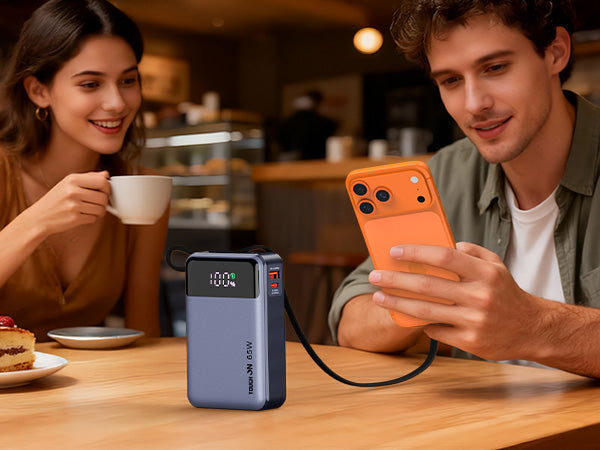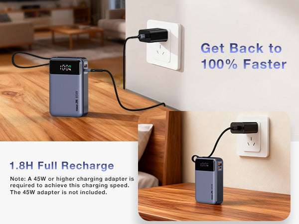 Recharge the power bank in about 1 hour 40 minutes with a 45W PD wall charger (not included) — 2–3× faster than standard power banks.