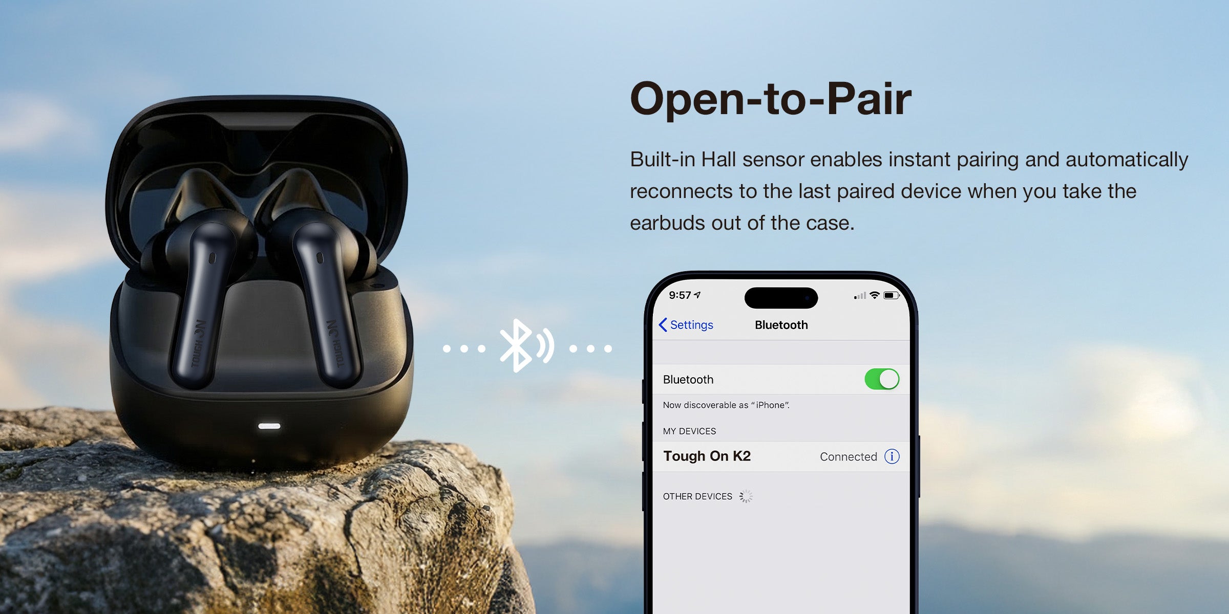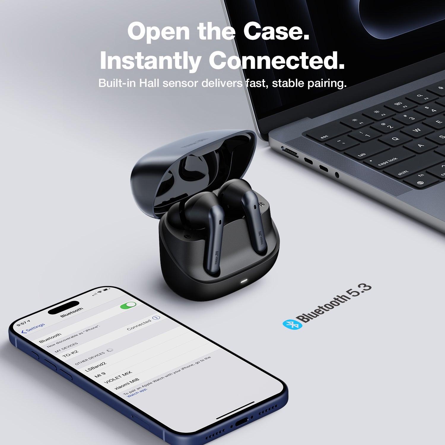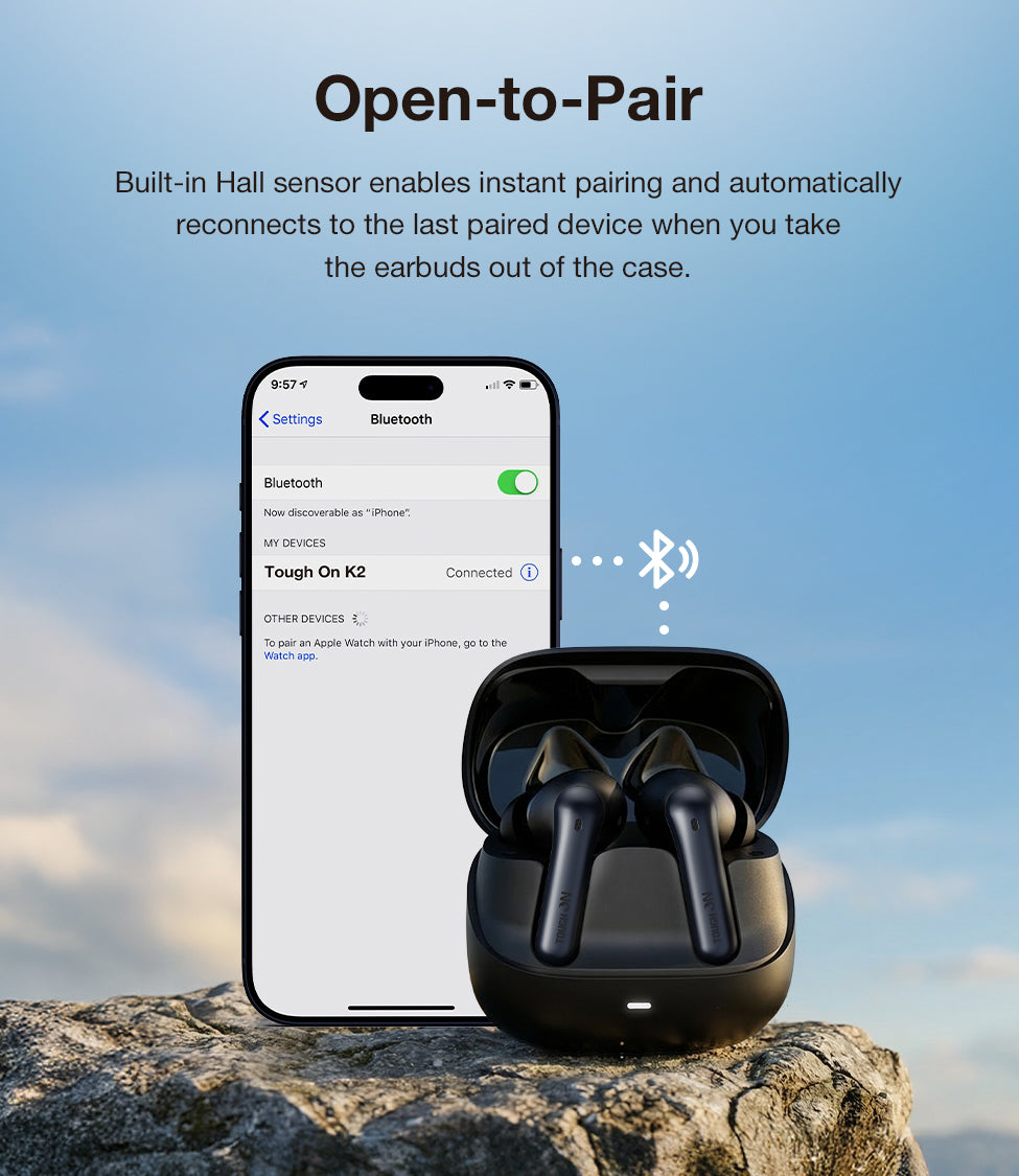 Forget manual pairing. Thanks to the built-in Hall Sensor, these wireless in-ear headphones feature Open-to-Pair technology. The moment you flip the lid, they instantly reconnect to your last device.