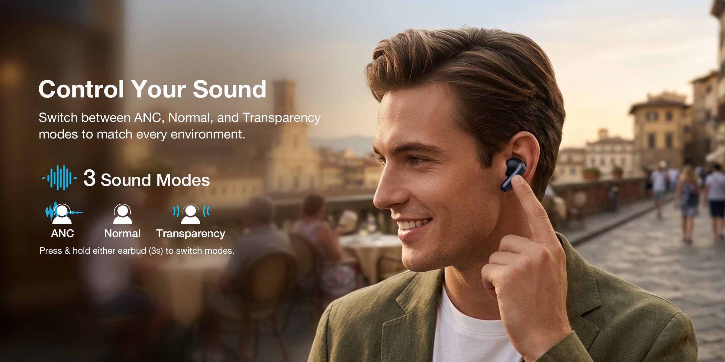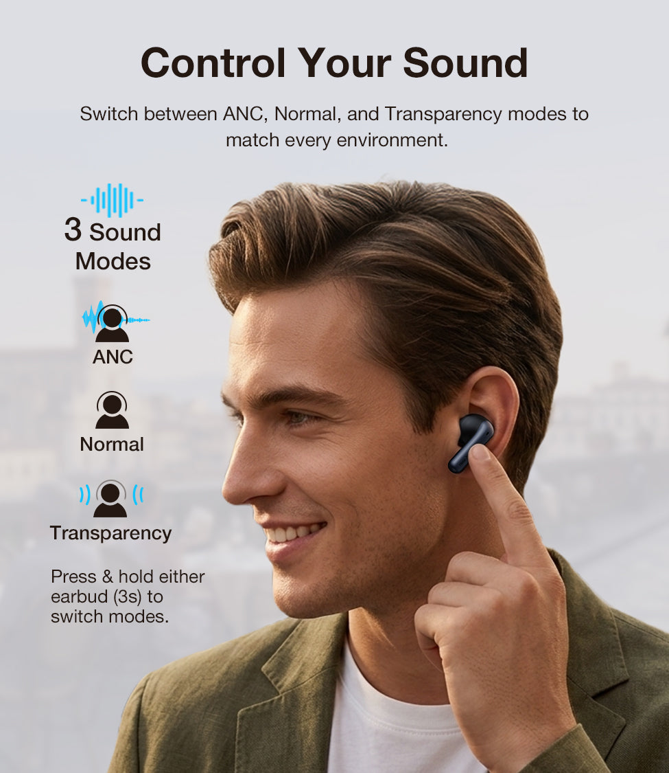 • Mode Switch: Press/hold (3s) to toggle ANC | Transparency | Normal.