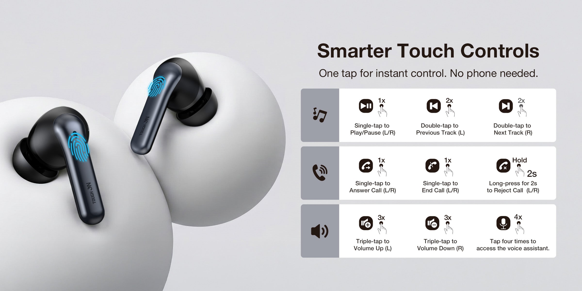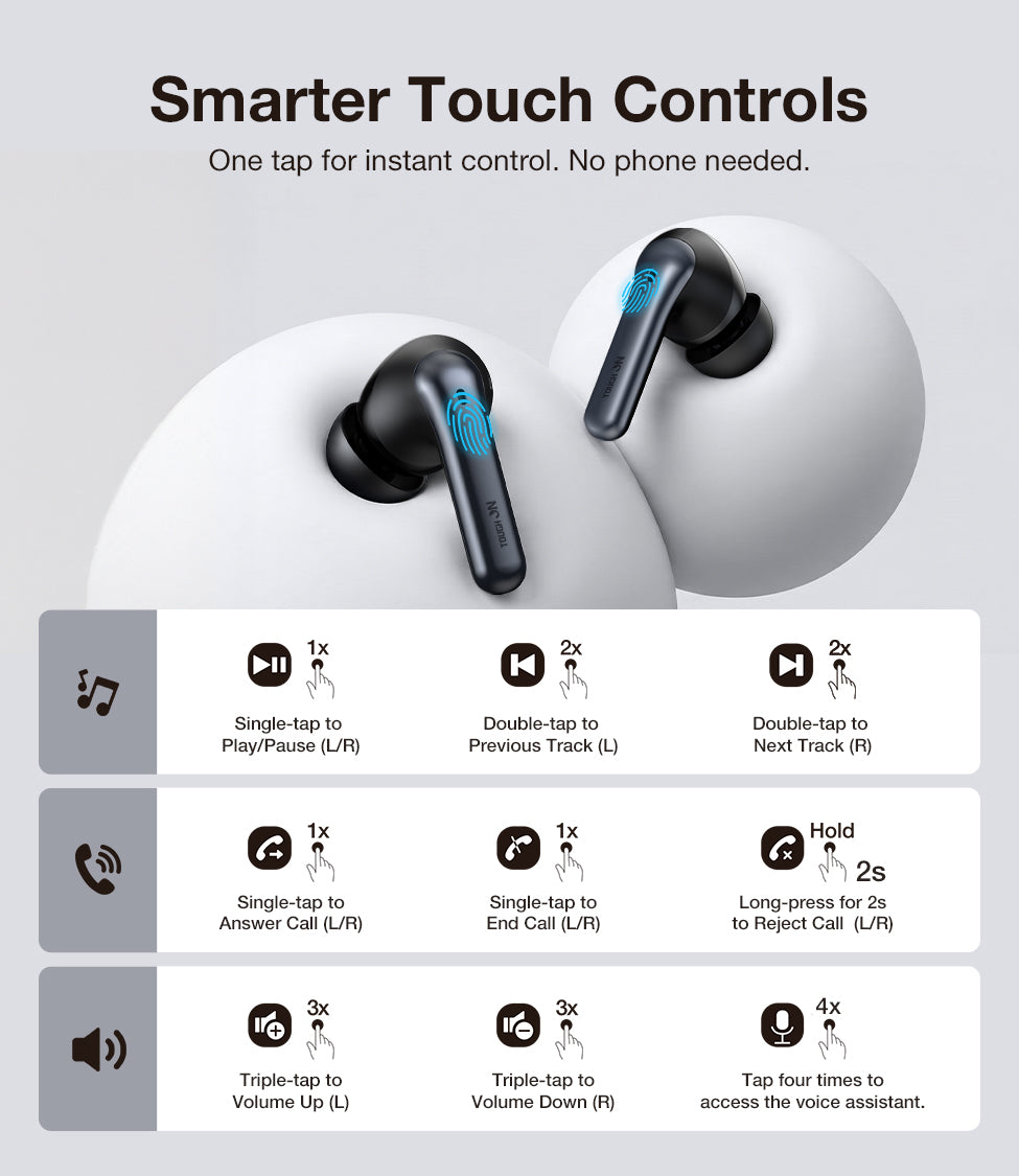 • Music and Calls: 1-tap (Play/Pause/Answer), 2-tap (Next/Prev), 3-tap (Volume).