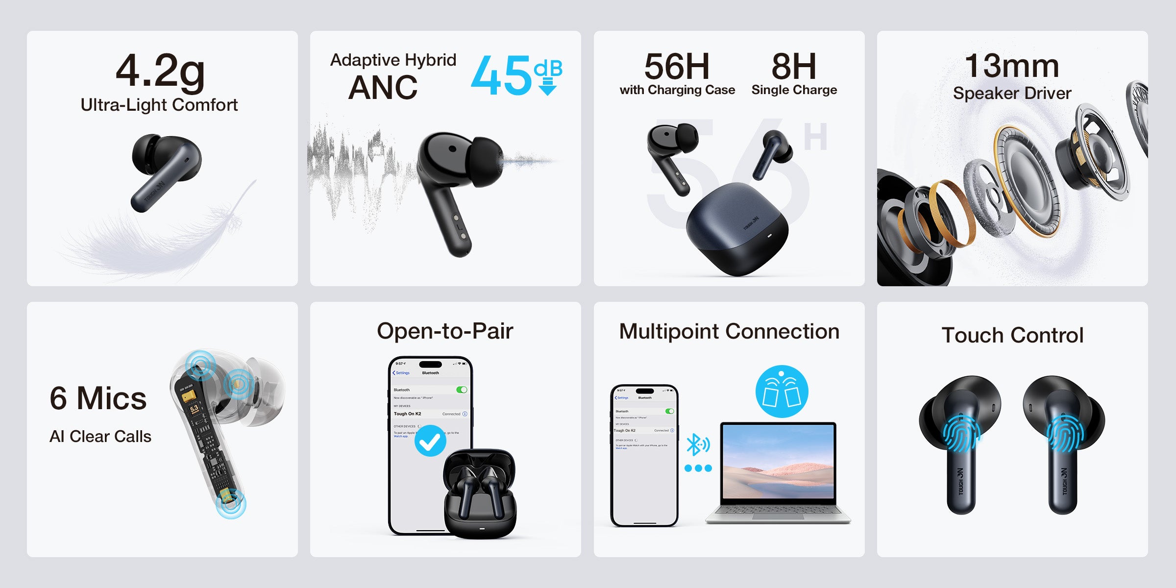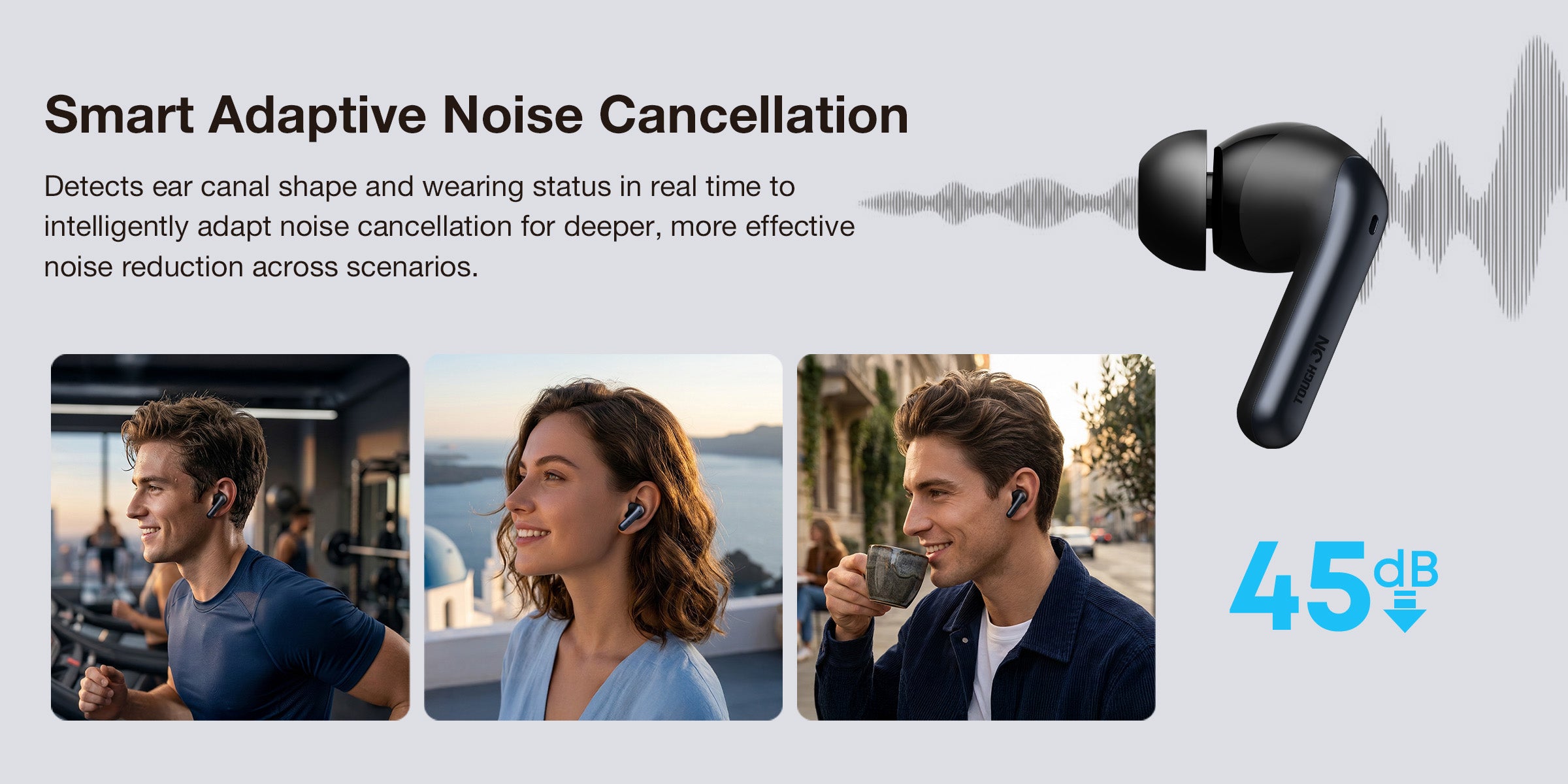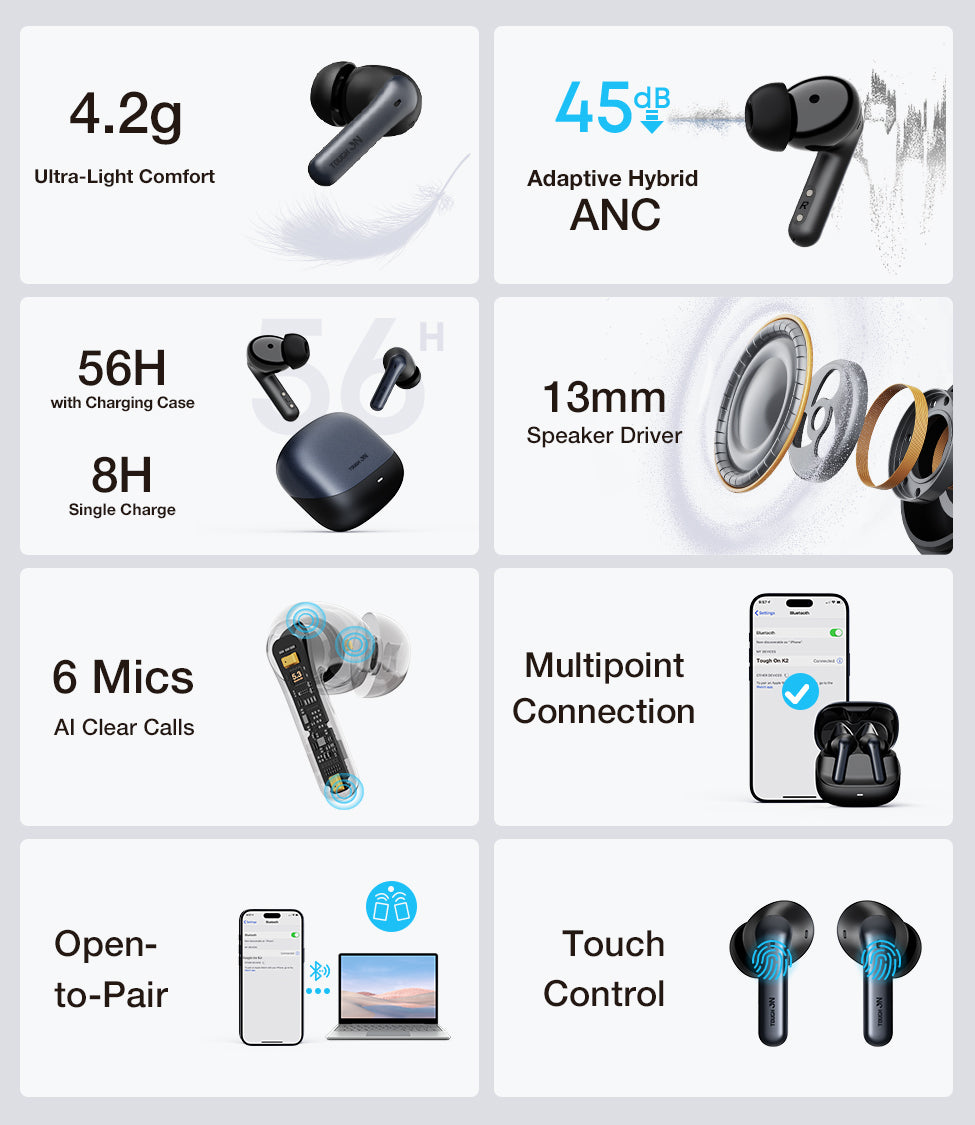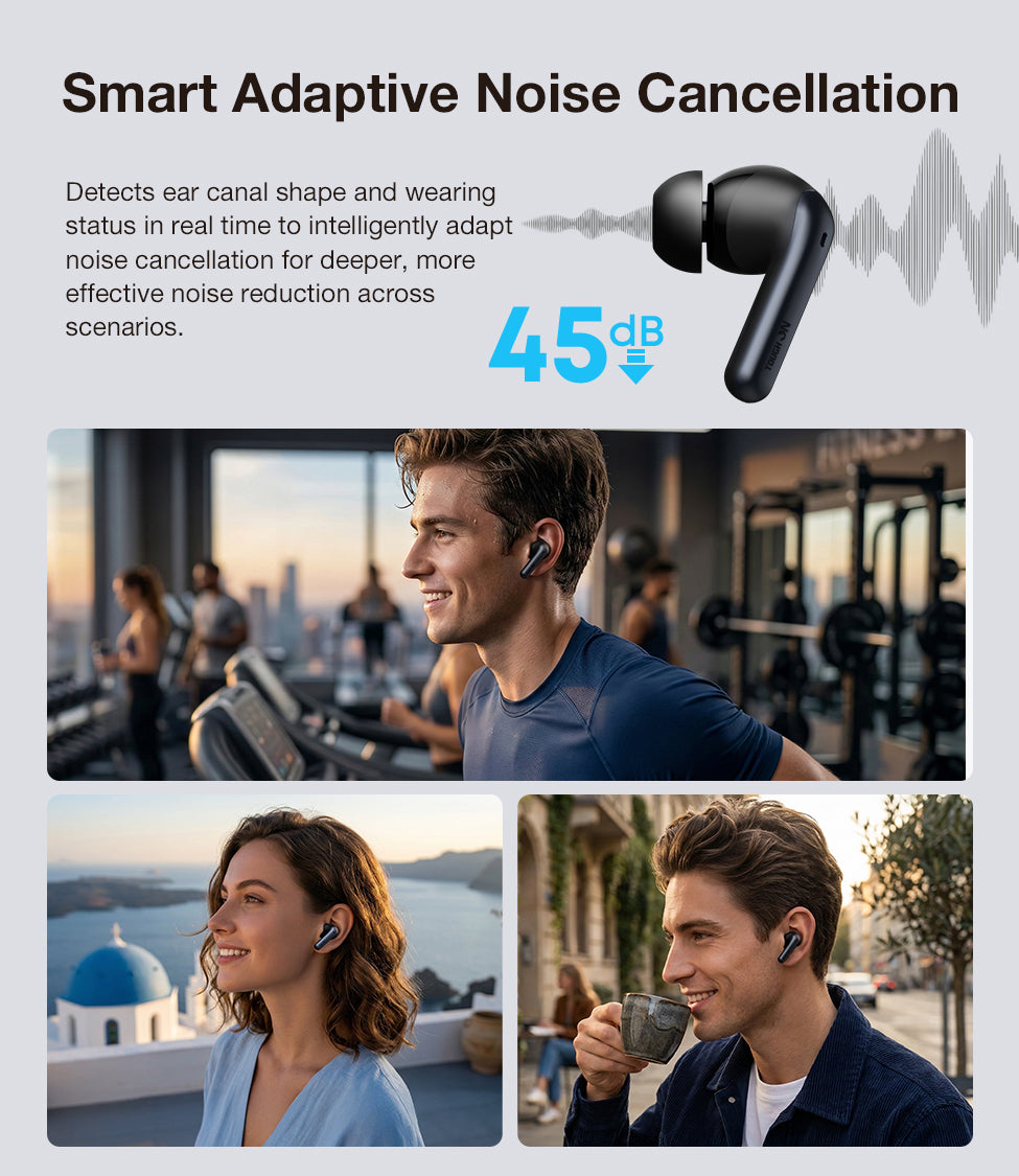 • 45dB Hybrid ANC: Feedforward and Feedback mics work together to neutralize ambient noise.