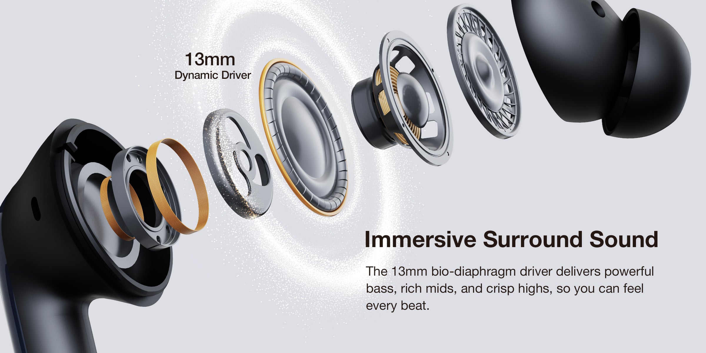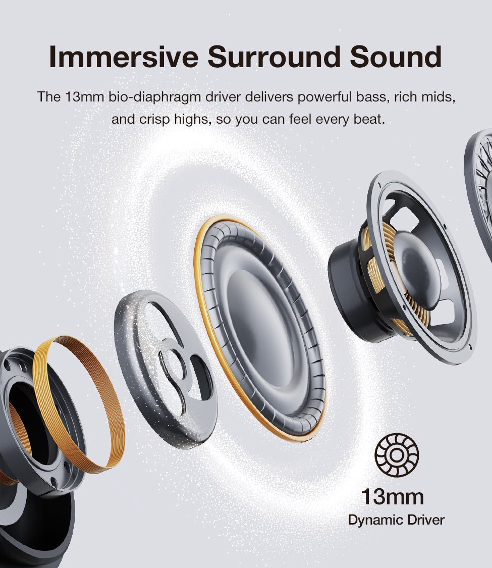 • 13mm Bio-Diaphragm Driver: Delivering deep, resonant bass and crisp, Hi-Res trebles for a studio-like experience.