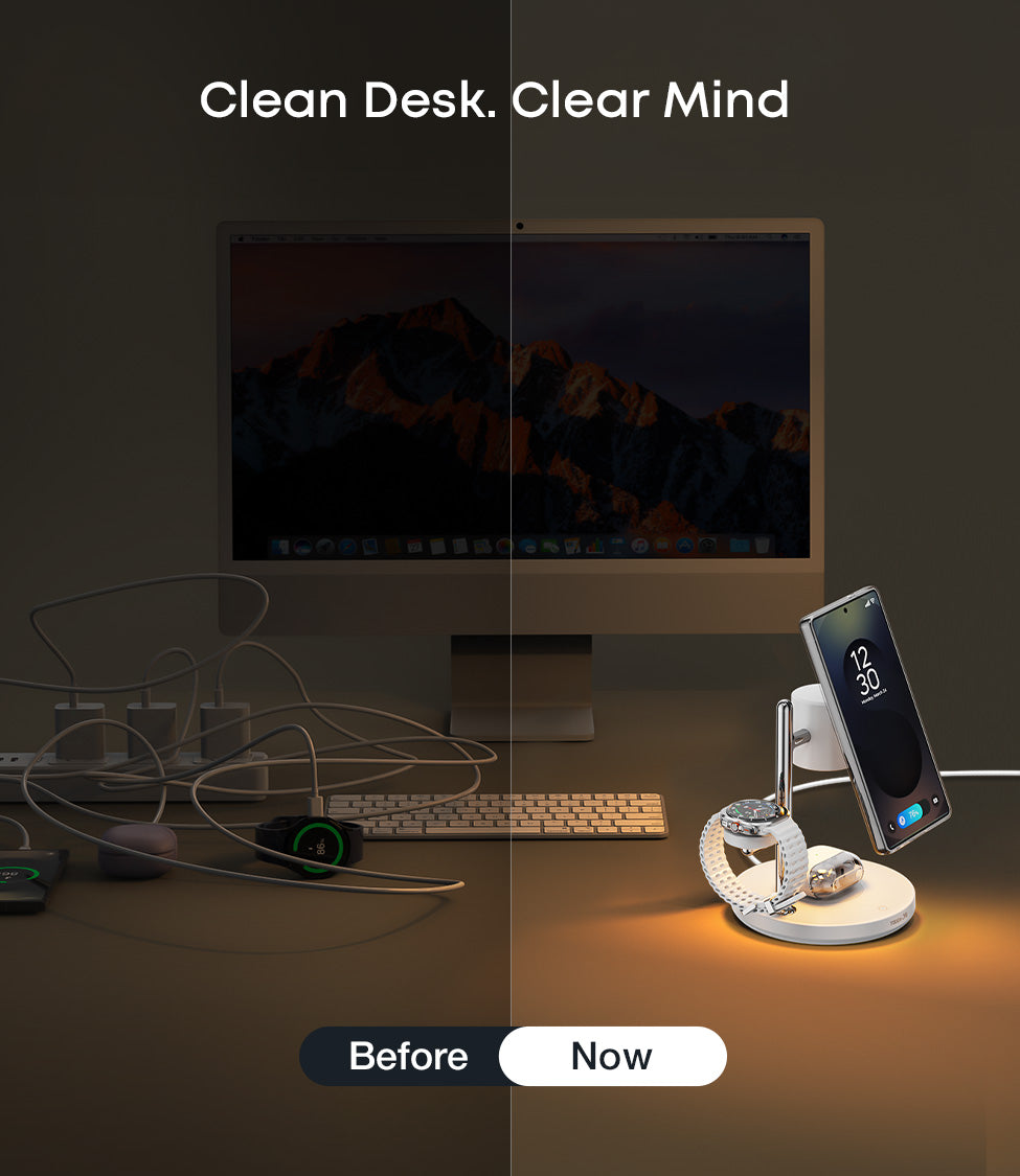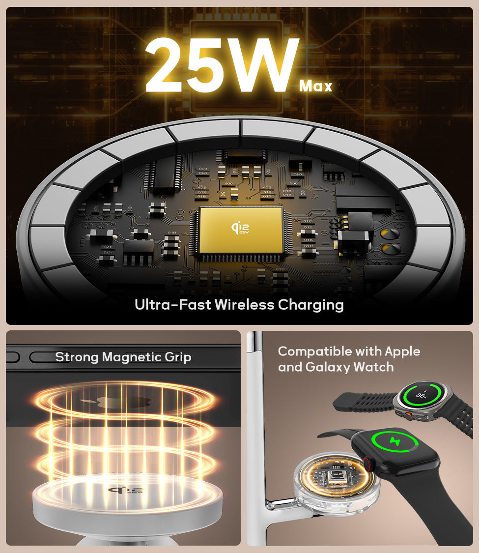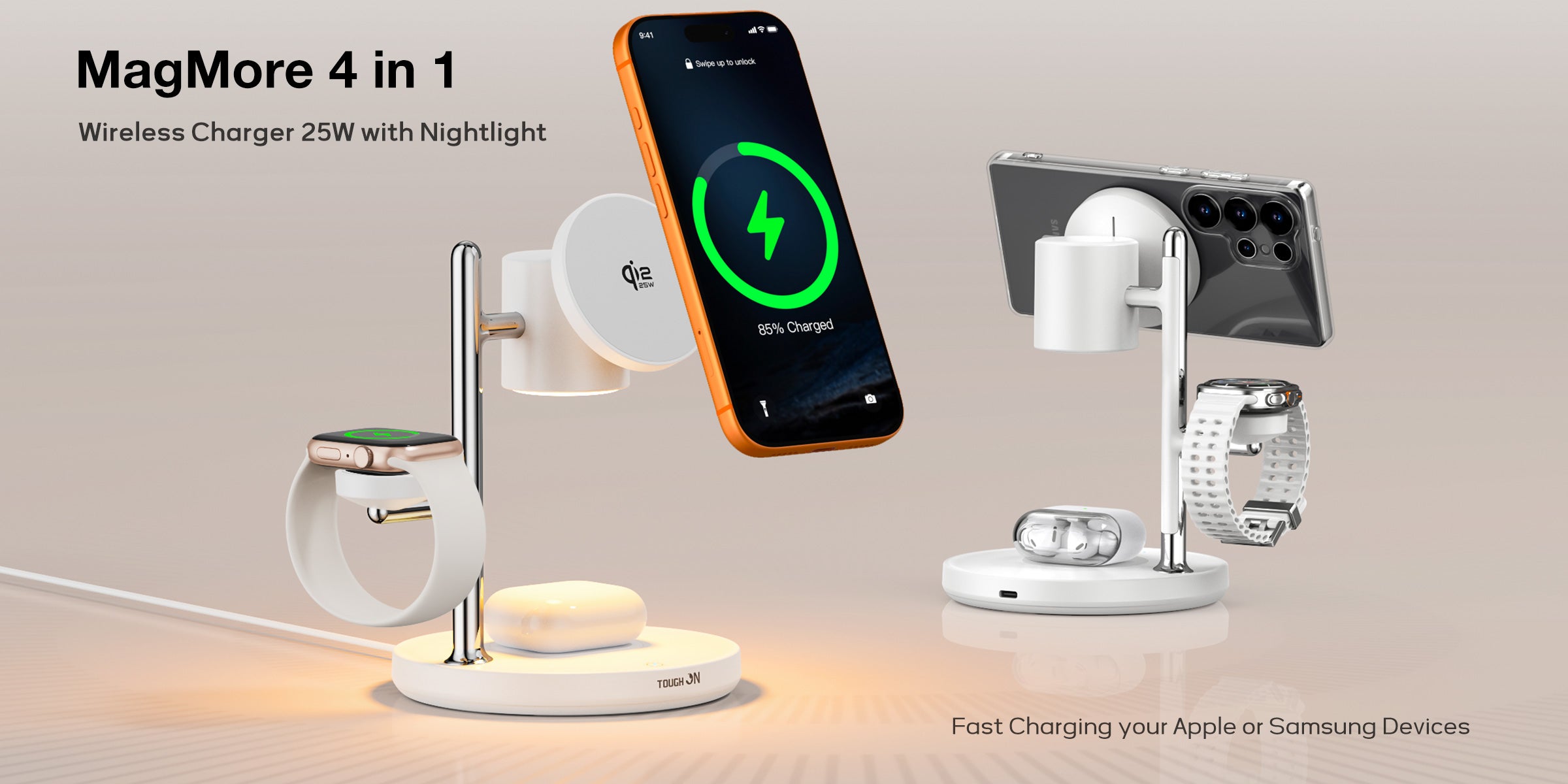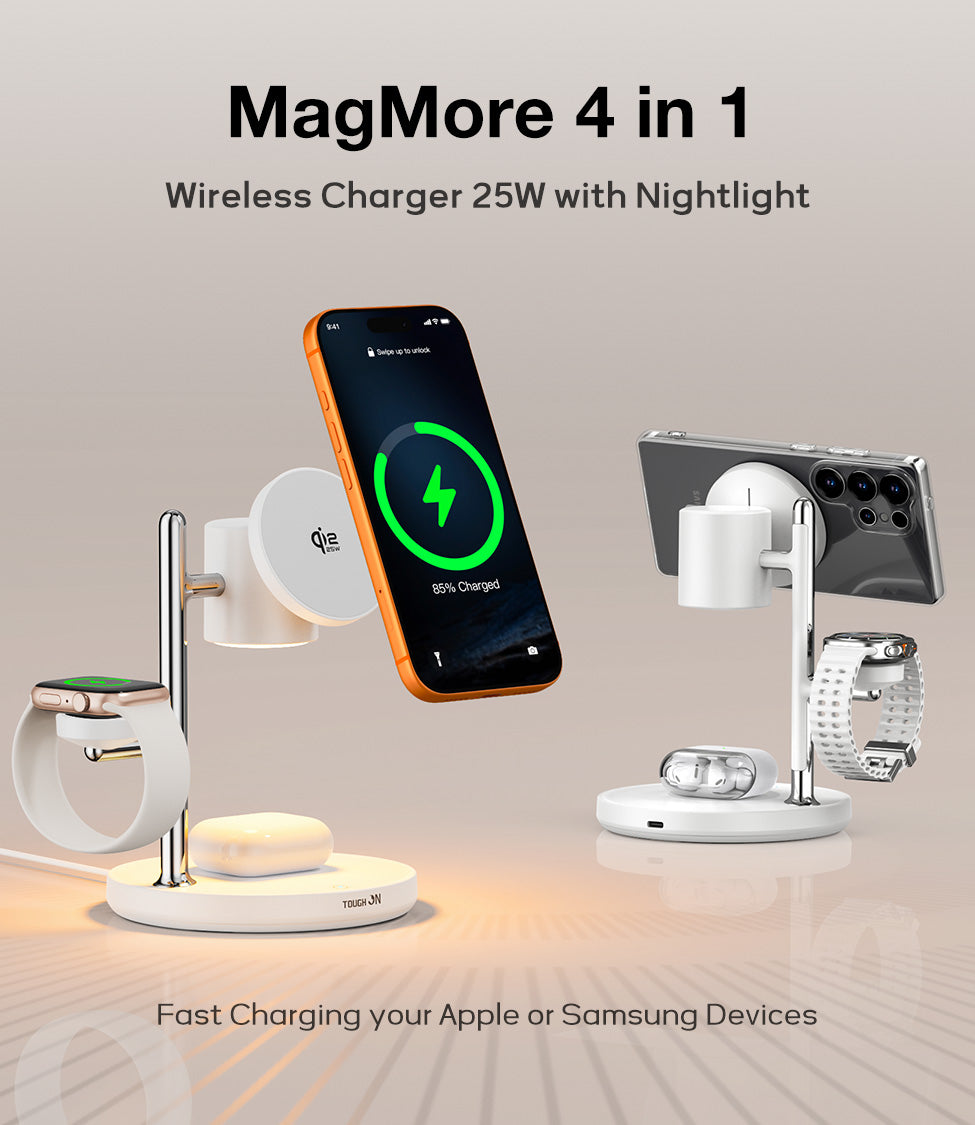 Keep your space tidy while charging all your everyday devices at once. The MagMore 4-in-1 Wireless Charger delivers up to 25W fast charging and includes a built-in nightlight, making it ideal for your desk, bedside table, or home office.