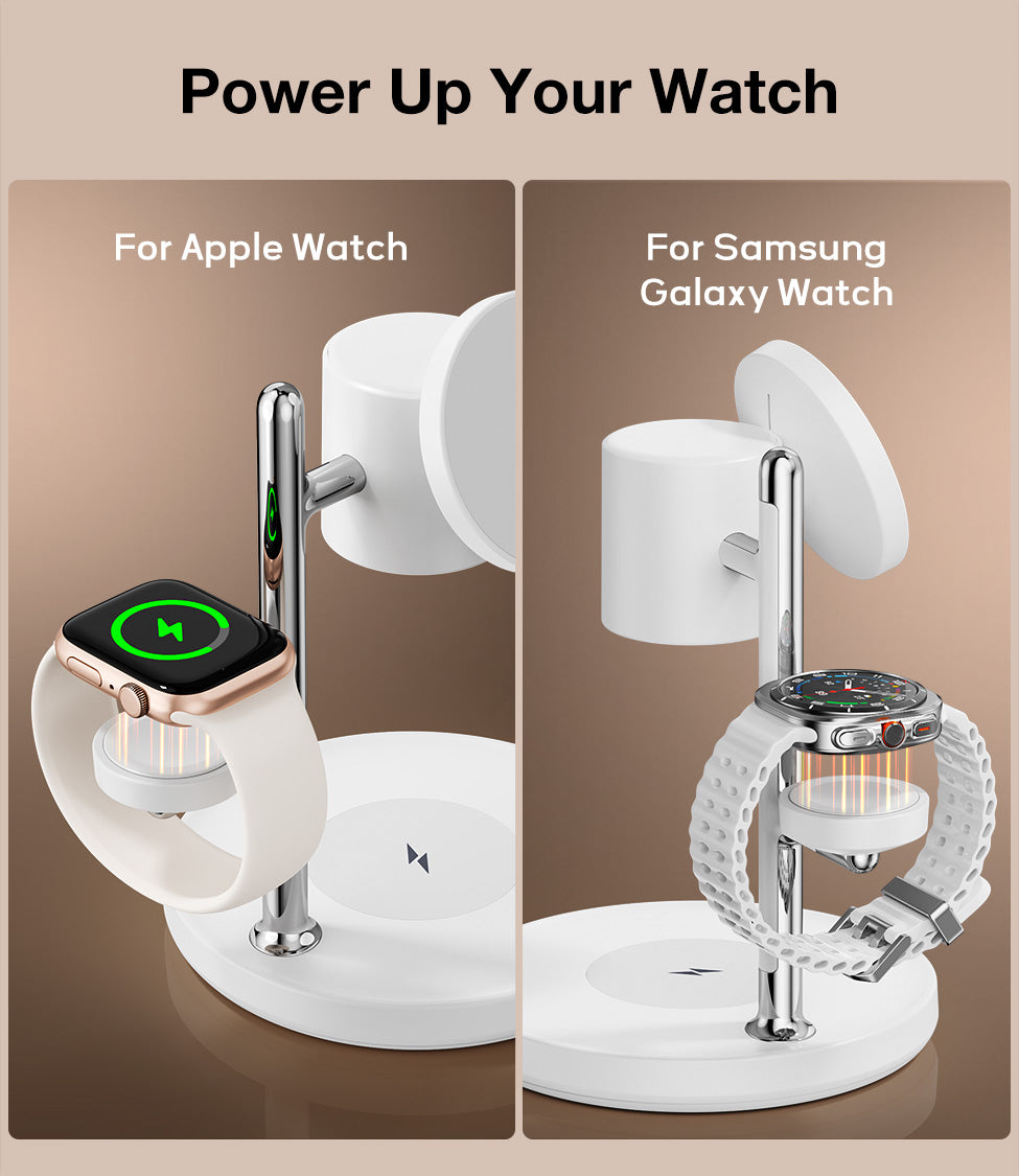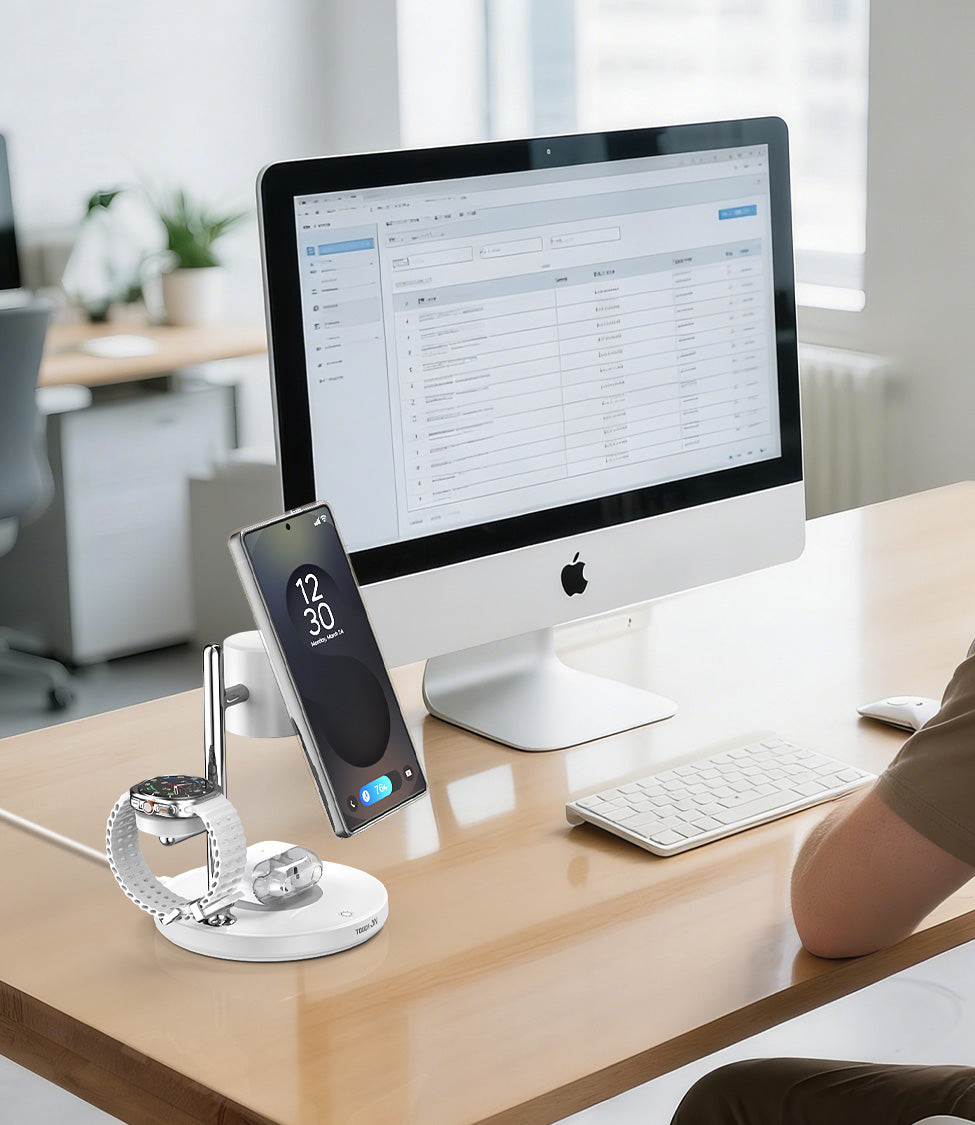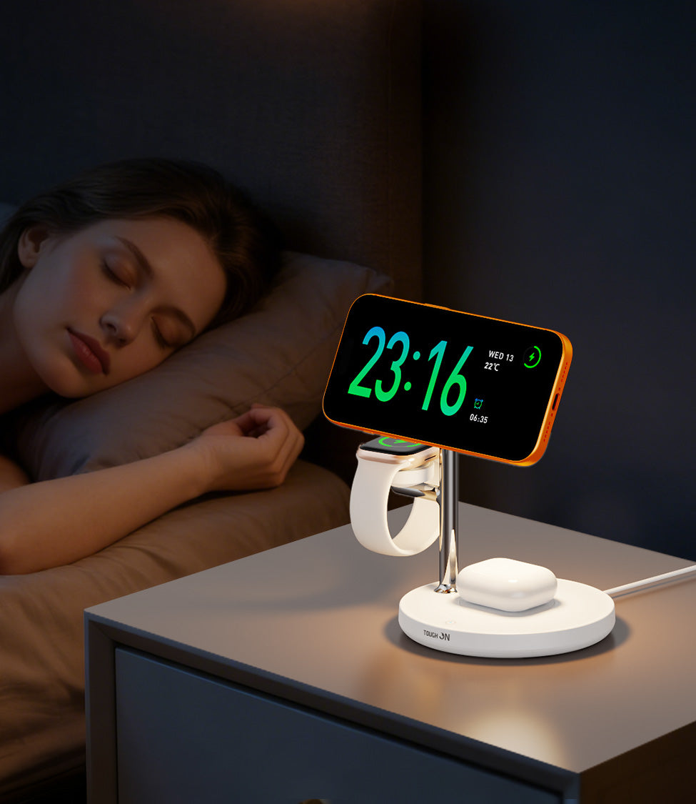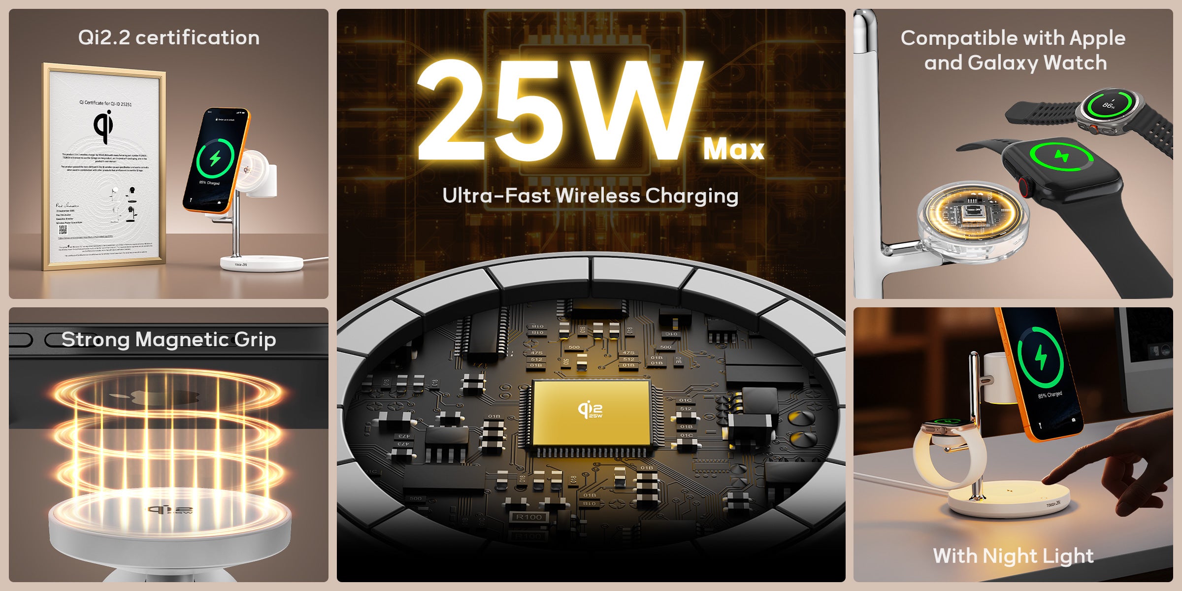 Keep your space tidy while charging all your everyday devices at once. The MagMore 4-in-1 Wireless Charger delivers up to 25W fast charging and includes a built-in nightlight, making it ideal for your desk, bedside table, or home office.