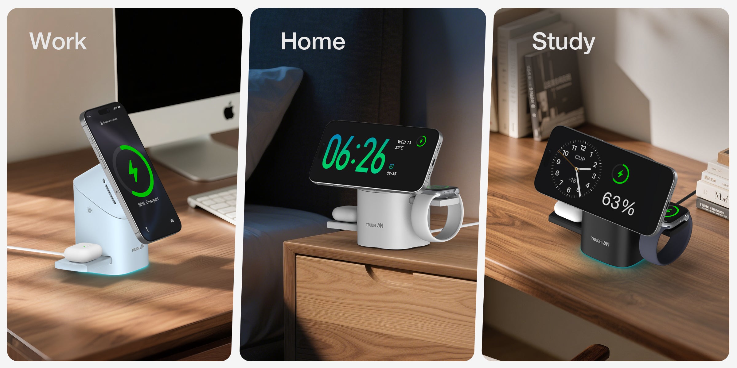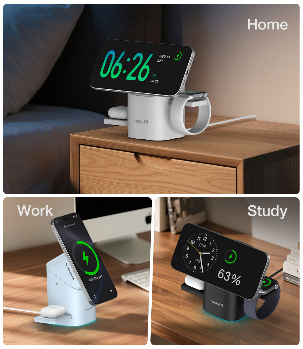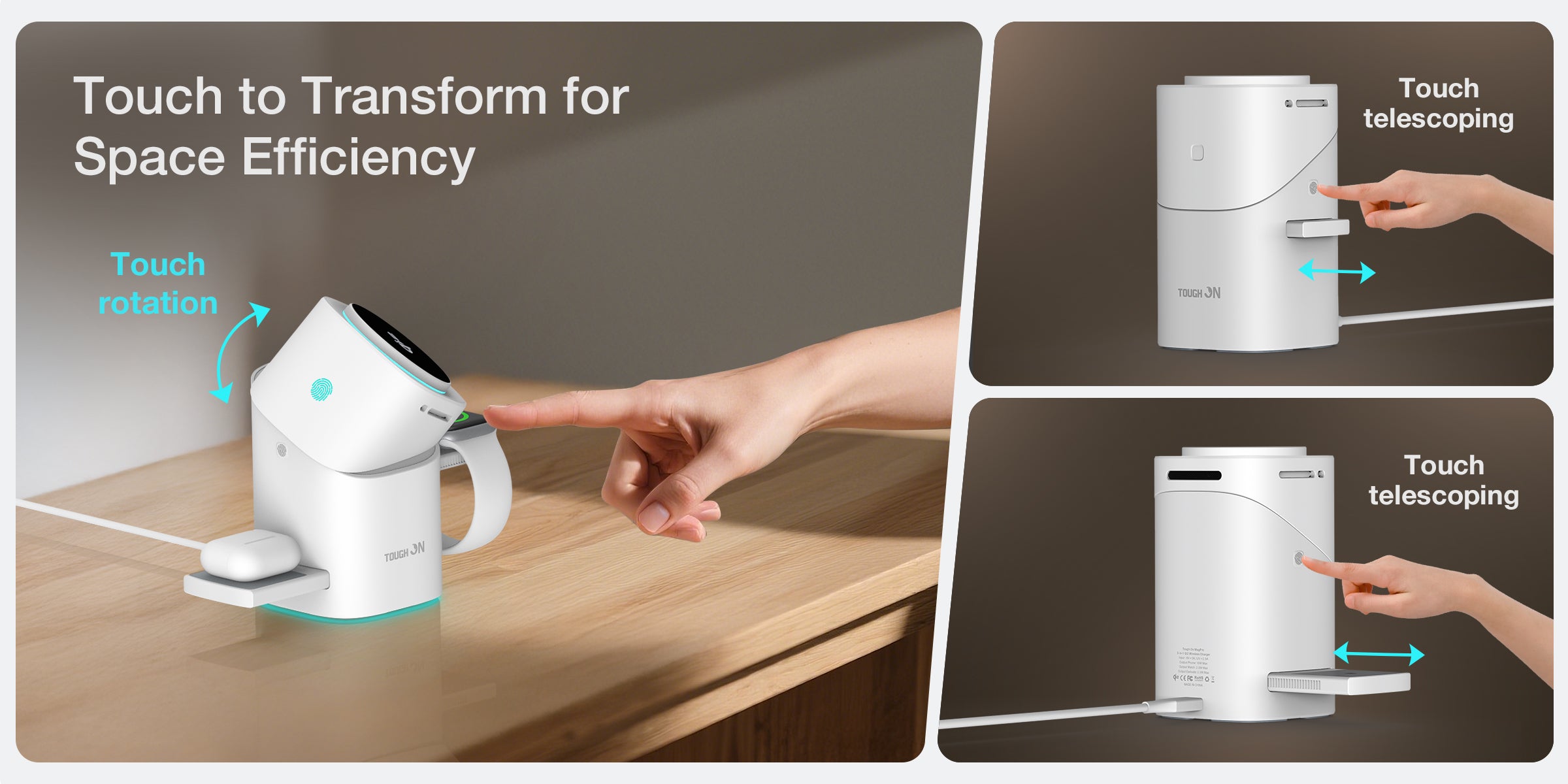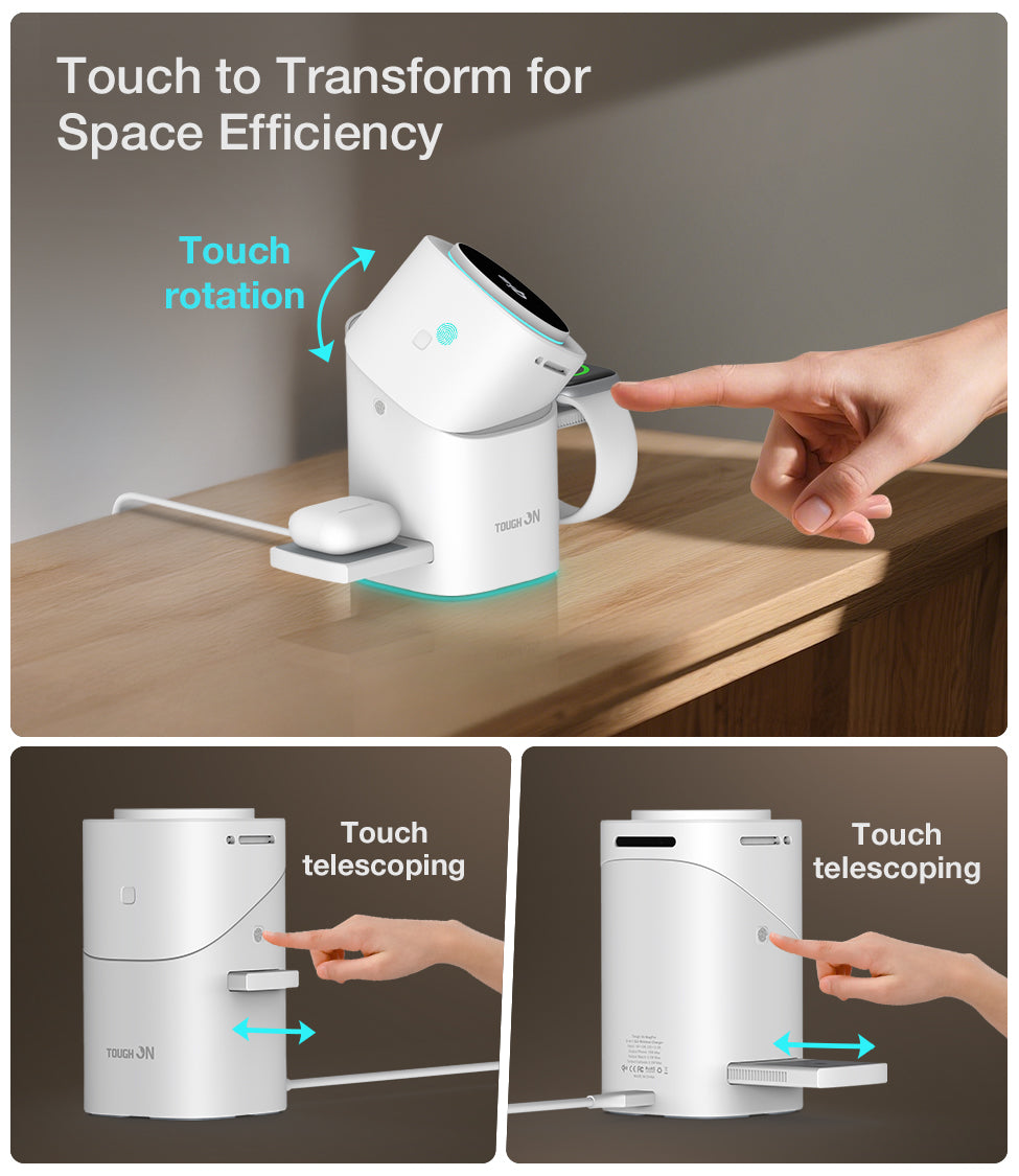 With a simple touch, you can rotate the phone charging stand to easily adjust the angle. The touch control also allows you to open or hide the charging slots for the Apple Watch and AirPods, enabling more efficient use of space.