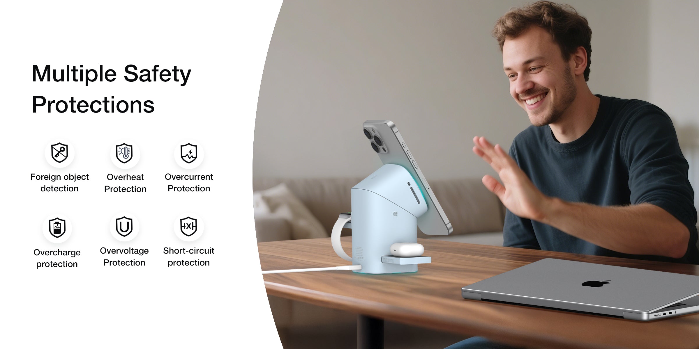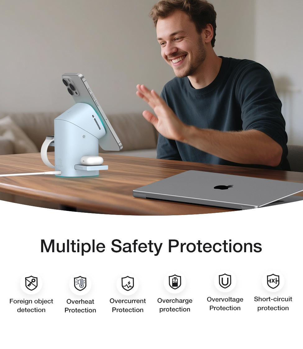 Equipped with an intelligent chip and strict Qi2 charging protocols, our charger continuously monitors temperature and provides foreign object detection, overvoltage protection, overcurrent protection, and short-circuit protection. Enjoy a safer and more efficient charging experience with built-in advanced safety features.